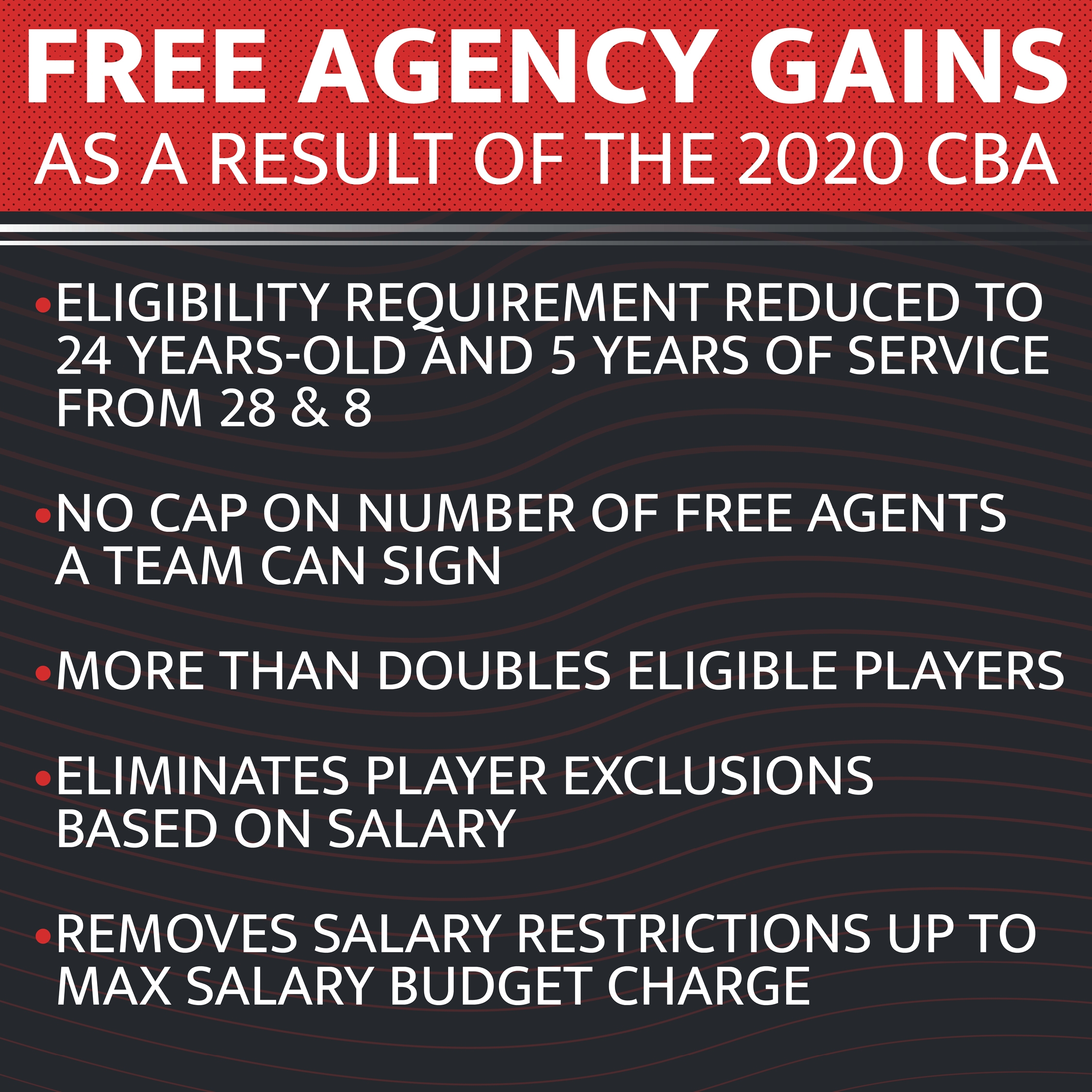 MLS players negotiated for and won major free agency gains in the last Collective Bargaining Agreement (CBA), lowering eligibility standards significantly to include more of the player pool, removing caps on the number of free agents teams could sign, and eliminating player exclusions based on salary.