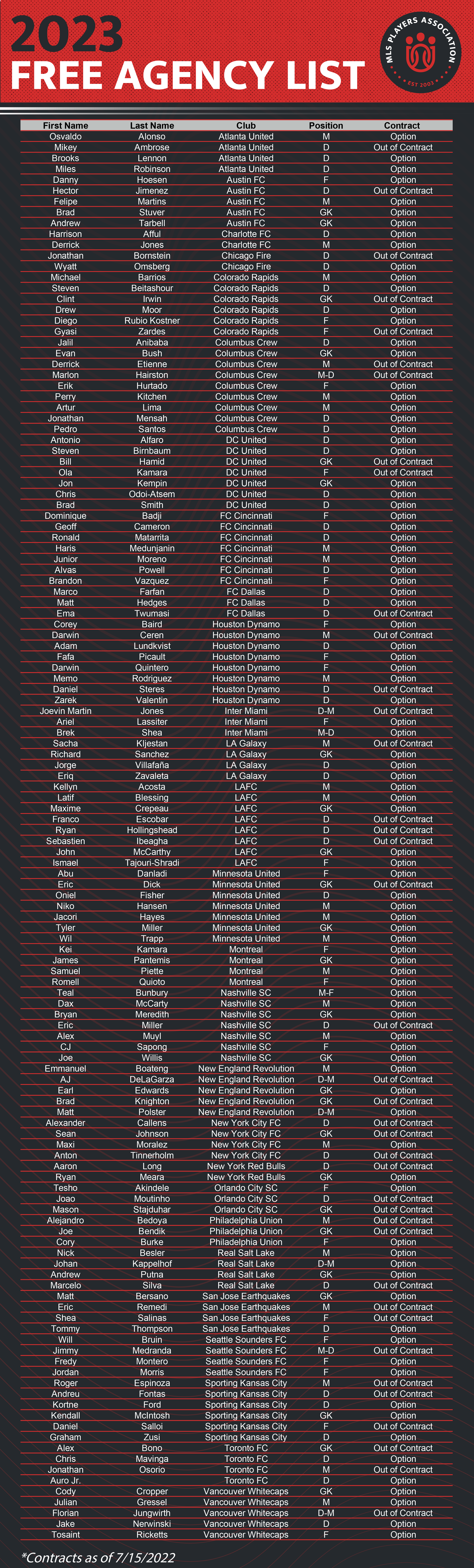 The list of players who are eligible for free agency ahead of the 2023 season is now available. Included in the list are both free-agency eligible players who are out of contract, as well as free-agency eligible players who are out of contract but have an option year remaining on their contract.