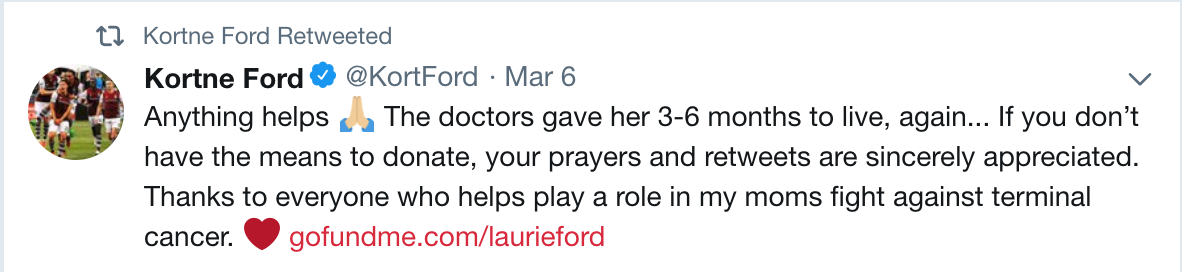 In light of the situation and to ease the immense financial burden cancer creates, a GoFundMe page was started for Laurie that, to date, has almost 600 donations totaling to over $45,000. A remarkable number of people have rallied behind her fight. “It’s friends, it’s family, it’s strangers, it’s the Colorado Rapids community, it’s literally everyone that’s had an impact in my life and who has known me personally and anybody who has known my mom," said Ford.