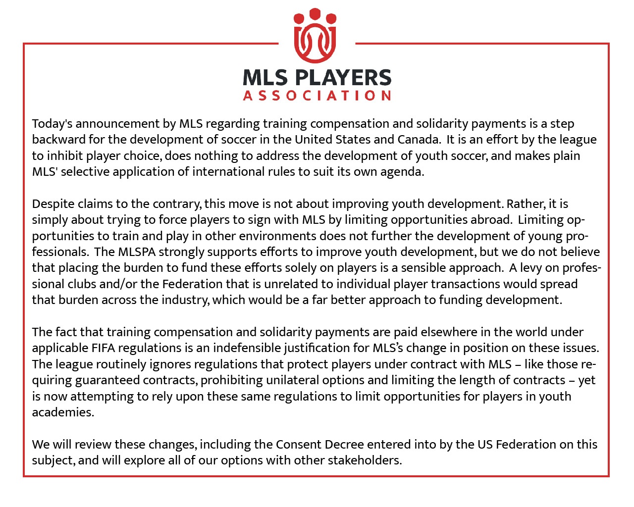 The MLSPA released the following statement today in response to the announcement made by MLS regarding Training Compensation and Solidarity Payments: