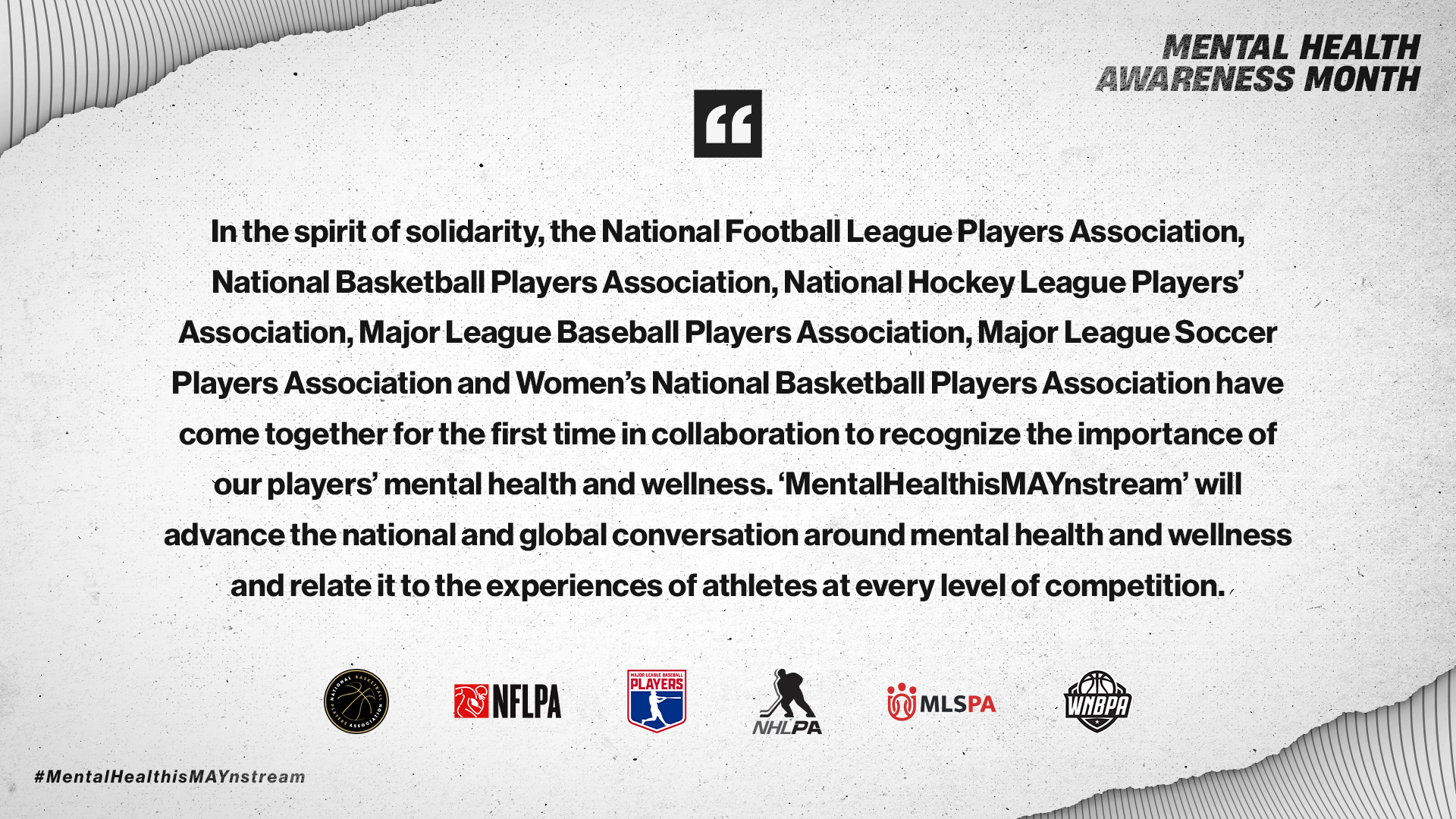 In their latest effort to invest resources, raise awareness and build a safe space for the wellness of the professional athlete community, the NFL Players Association (NFLPA), National Basketball Players Association (NBPA), NHL Players' Association (NHLPA), MLB Players Association (MLBPA), MLS Players Association (MLSPA) and Women’s National Basketball Players Association (WNBPA) announced a collaborative campaign on Monday for May’s Mental Health Awareness Month.